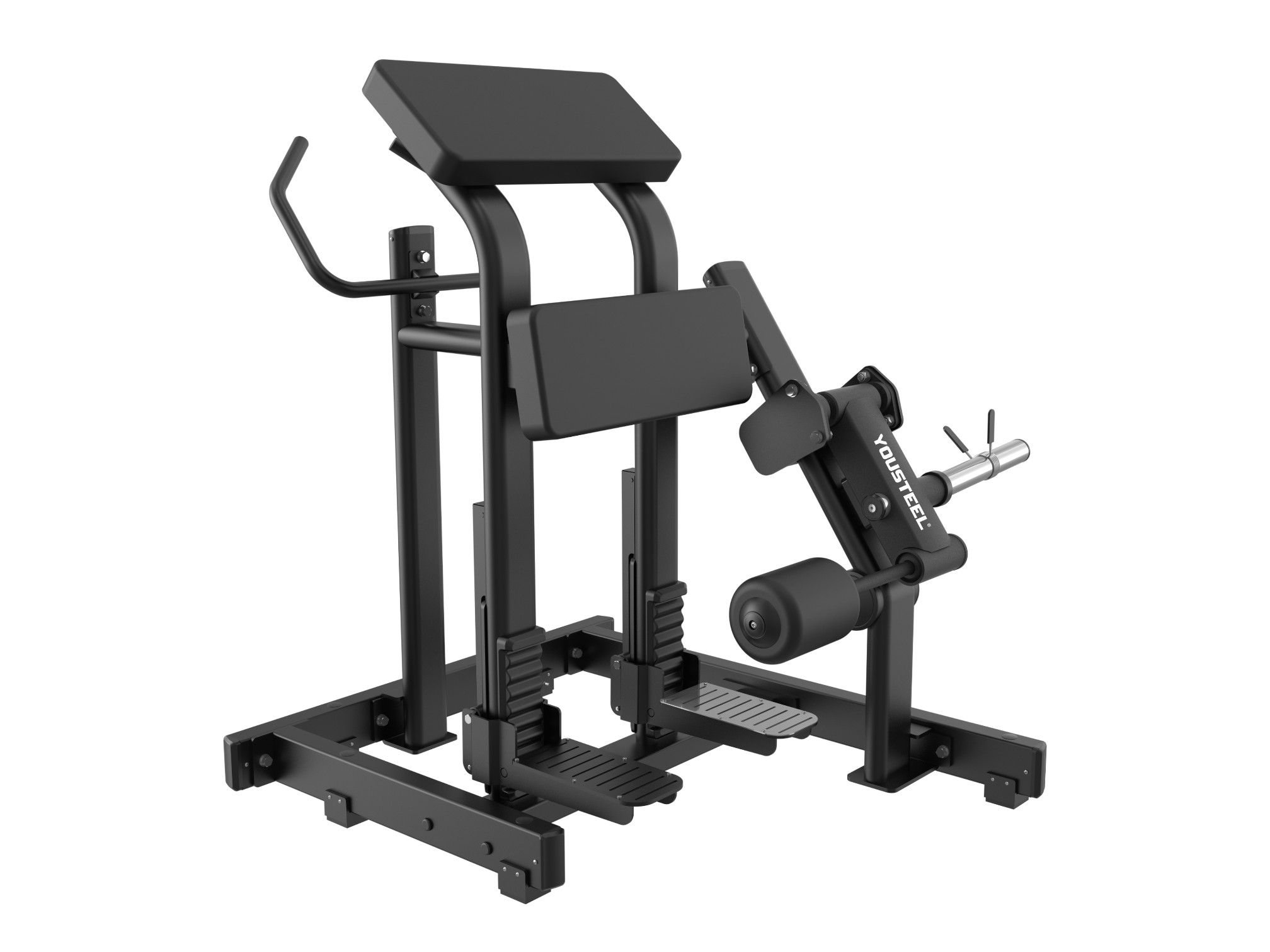 Сгибание ног стоя — это профессиональный тренажер нагружаемый дисками. Предназначенное для изолированной проработки бицепса бедра с упором на колено. В отличие от сгибаний сидя или лежа, данный вариант позволяет работать над каждой ногой по отдельности, что помогает устранить мышечный дисбаланс. Удобная подушка для колена и для локтей позволяют эффективно изолировать заднюю поверхность бедра и тренировать ноги по отдельности. Благодаря правильному наклону подушки для колен и подставки для локтей снимается нагрузка на поясницу. Рукоятки с нескользящим покрытием обеспечивают надёжную фиксацию. Упоры для ног покрыты нескользящим текстурированным стальным листом и имеют ступенчатую регулировку под рост пользователя. Каркас выполнен из толстостенного стального профиля 3мм и сварен на современном лазерном оборудовании. Хромированная втулка для дисков расположена под углом для предотвращения сваливания блинов, выдерживает нагрузку до 150кг, имеет посадочный диаметр 50мм и снабжена резиновым защитным кольцам для предотвращения повреждения конструкции тренажера. Подушка толщиной 60мм, из пенополиуретана обтянута искусственной кожей. Максимальная общая на тренажер 450кг.