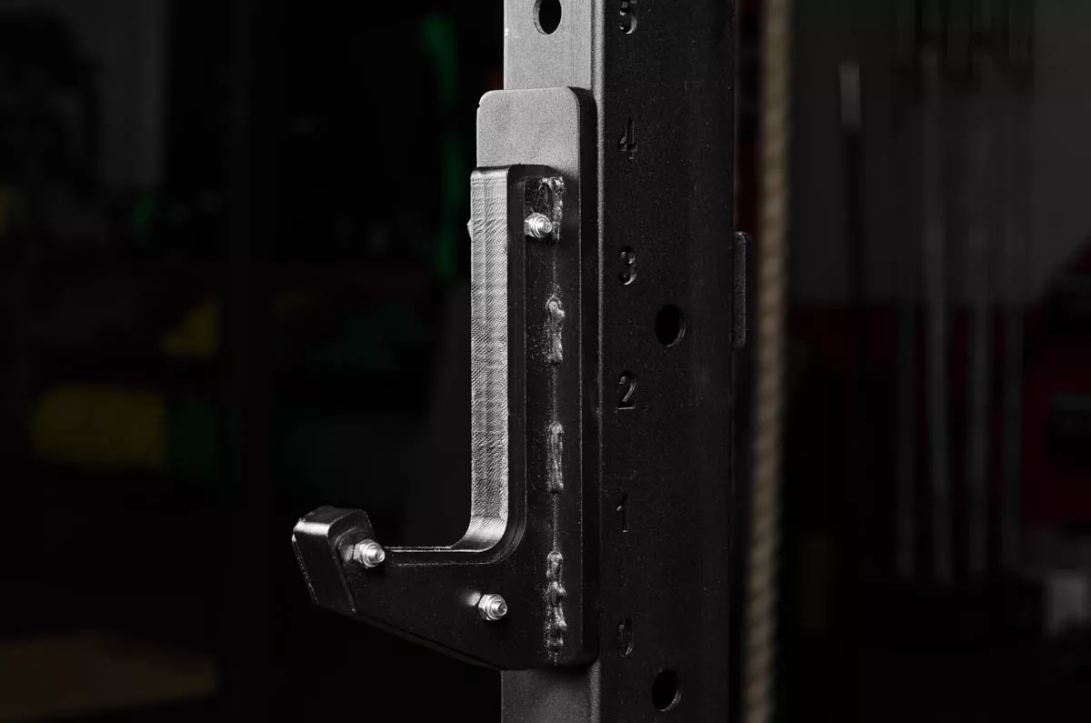 Для защиты насечки грифа, в местах касания с крюком, мы используем специальный пластик, который убережет гриф от повреждений. Усиленные крюки изготовлены из стали толщиной 6мм и выдерживают статическую нагрузку до 200кг на каждый крюк. Однако, стоит помнить, что они предназначены для удержания штанги, поэтому бросать её на них не рекомендуется.