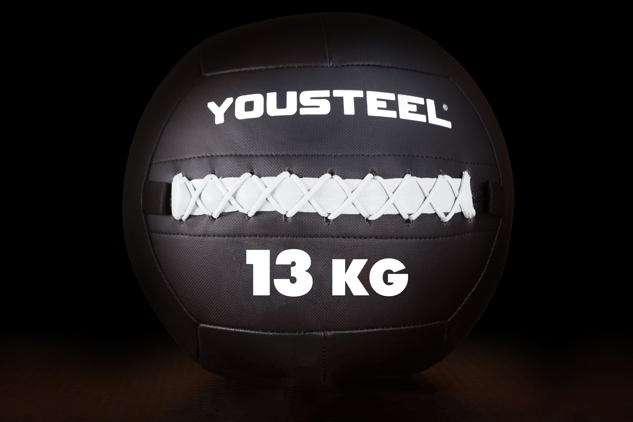 Медбол представляет собой утяжеленный мяч, диаметром 355мм и весом 13кг. Оболочка мяча выполнена из износостойкого ПВХ, которое обеспечивает оптимальное сцепления с ладонями занимающихся и предотвращает выскальзывание из рук, даже если вы вспотели. Для простоты ориентации каждый снаряд имеет цифровое обозначение веса и цветную вставку. Каждый шов прошивается нейлоновой нитью, что обеспечивает повышенную надёжность. Уникальность мячей в том, что мы используем внутри систему «скорлупы». Под оболочкой из ПВХ находится мягкий слой из вспененного полиуретана высокой плотности, который служит для предотвращения смещения центра тяжести, это происходит за счет концентрации тяжелых частиц набивки в самом центре ядра «скорлупы» мяча.