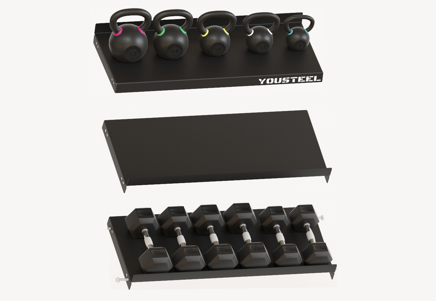 Полка стеллажа 1050мм — это универсальный элемент стеллажа, созданный для организации пространства хранения гирь/гантелей и прочего оборудования, которое можно разместить на плоской поверхности. Данная полка может быть установлена как горизонтально, что даст ровную плоскую поверхность, так и под наклоном, что даст удобное пространство для хранения гантелей, с упором под передний край.