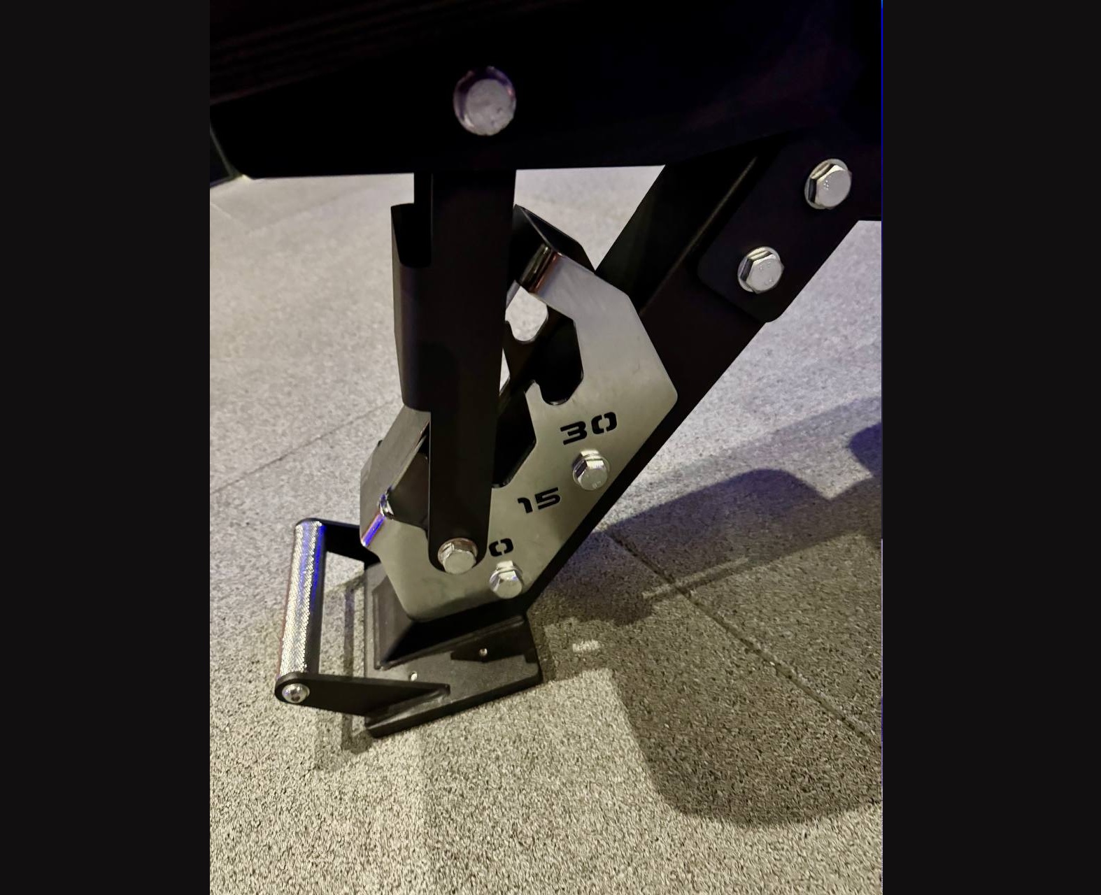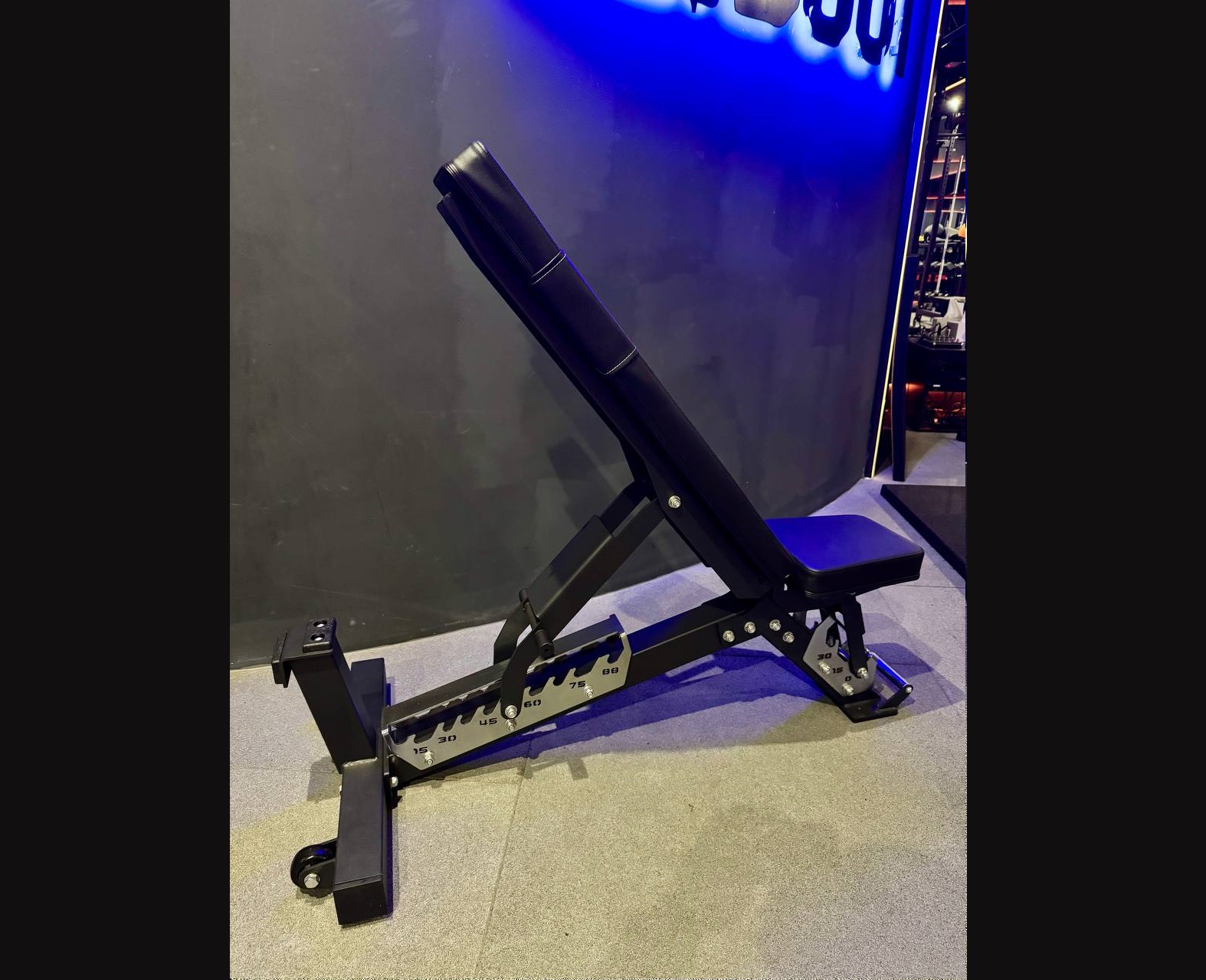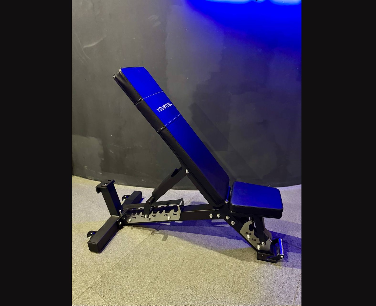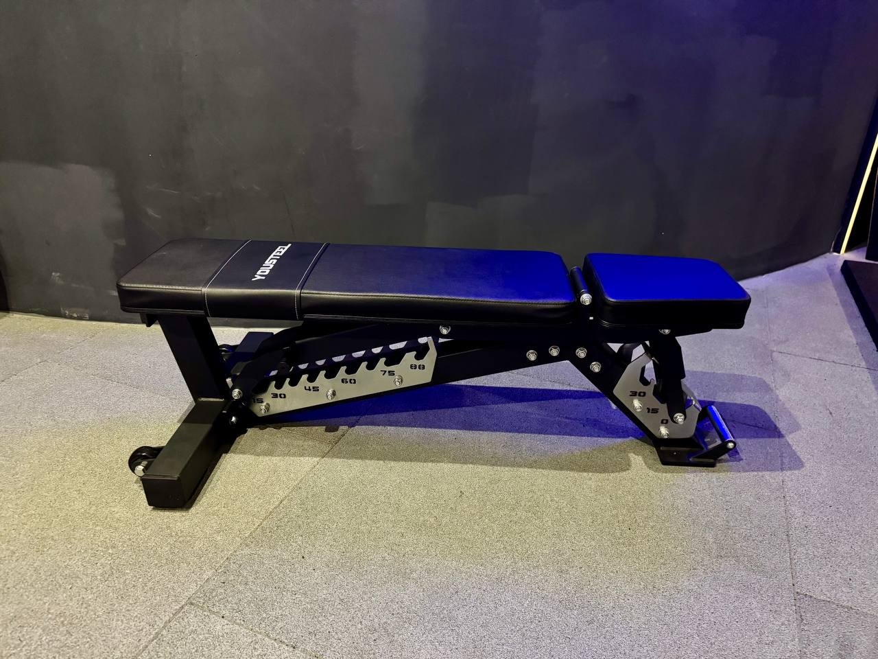 В основу ее конструкции мы положили ступенчатый механизм регулировки и прямоугольное цельное полотно спинки. Скамья состоит из 2 независимых подвижных частей. Первая часть — это сидень, которое имеет 3 степени регулировки углов, 0°, 15°, 30°. Вторая часть — спинка, она имеет целых 10 углов регулировки, 0°, 15°, 30°, 37°, 45°, 50°, 60°, 67°, 75°, 88°. Чтобы зафиксировать выбранный угол наклона, установите фиксатор на нужной ступеньке. Система регулировки имеет специальную систему страховки. Мягкие части обиты устойчивой к истиранию антибактериальной эко кожей. Металл — порошковой краской. Основании скамьи Т образной формы обеспечит безупречную устойчивость. Чтобы вам не таскать скамью, мы сделали колесики на широкой ножке и ручку с насечкой на противоположной стороне — подняли и покатили.