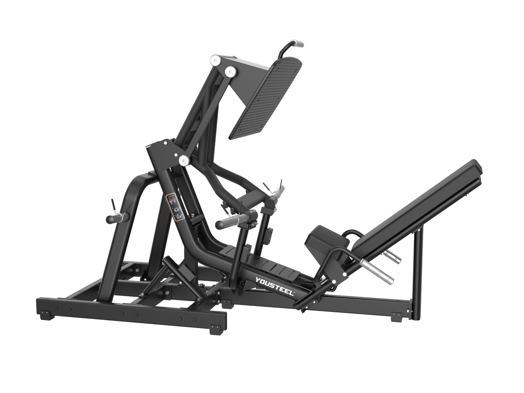 Жим ногами — это профессиональный тренажер нагружаемый дисками. Отлично подойдет для развития квадрицепсов, а также ягодичных и бицепса бедра. Благодаря длинной спинке тренажер подходит для людей разной антропометрии. Платформа упора нога имеет нескользящее резиновое покрытие. Рукояти из алюминия имеют насечку для надежного хвата. Рукоять на платформе упрощает заход и выход из тренажера. Неподвижный страховочный упор в нижней точке тренажера ограничивает ход платформы в случае аварийного завершения упражнения. Подвижный стопор позволяет легко и безопасно начинать и заканчивать подходы, а также ограничивает диапазон движения, позволяя проводить тренировки на начальном уровне подготовки. Оба упора имеют прочную конструкцию и снабжены резиновыми отбойниками, которые хорошо гасят удары и защищают раму от повреждений. Имеется два хромированный кронштейн для хранения дисков под посадочный диаметр 50мм. Втулки кронштейнов для дисков расположены под небольшим углом, для предотвращения скатывания дисков во время работы и хранения. Подушка толщиной 60мм, из пенополиуретана обтянута искусственной кожей. Каркас выполнен из толстостенного стального профиля 3мм и сварен на современном лазерном оборудовании. Максимальная весовая нагрузка до 450кг (по 225кг на каждую втулку).