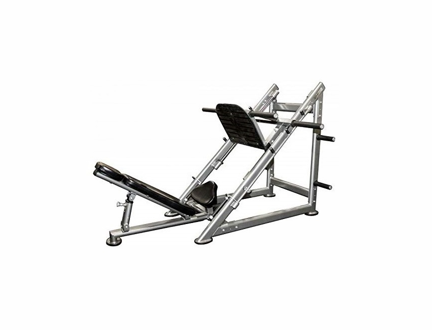 Тренажер жим ногами нацелен на прокачку четырехглавой мышцы бедра, большой ягодичной, а также подколенного сухожилия с минимальной нагрузкой на поясницу. Так как траектория движения платформы задана ограничителями, не требуется долгое освоение техники, а из-за отсутствия осевой нагрузки это упражнение безопаснее приседаний с весом. Эта изделие коммерческого класса обеспечивает стартовое сопротивление в 40кг и максимально нагружаемой нагрузкой до 450кг. Тренажер имеет габариты 2187x1692x1473мм. Максимальная нагрузка до 450кг.